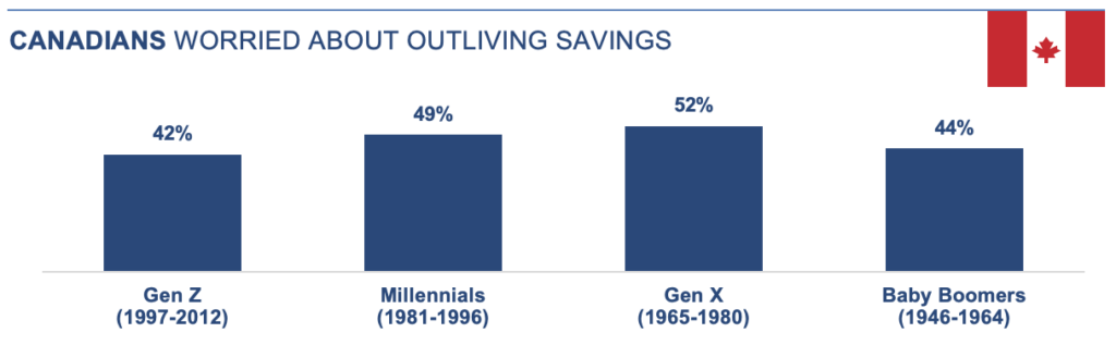 More than half of Americans (54%), especially Gen X (54%), were concerned that they’d outlive their retirement funds, while Americans from the boomer generation were least worried (45%).
